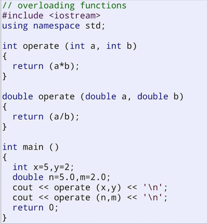 وفي المرة الثانية تم الاستدعاء وكان المعاملين Arguments عددين من نوع عشري هنا سوف يقوم المترجم باستدعاء الدالة التي تستقبل معاملات من نوع عدد عشري