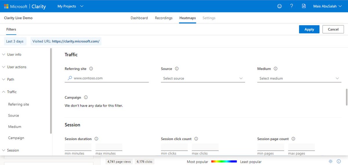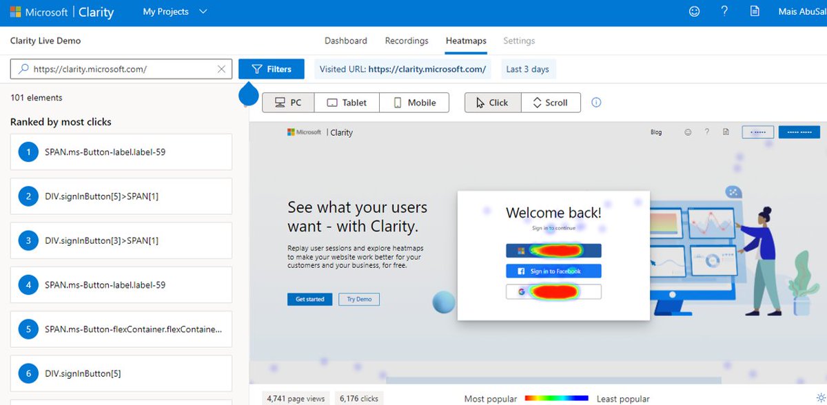 الأداة مقدمة من شركة مايكروسوف وتسمى clarity . توفر الأداة ما يسمى بالخرائط الحرارية أو Heat Maps بأكثر من طريقة بالإضافة إلى مجموعة من الإحصائيات الأخرى عن زوار موقعك.