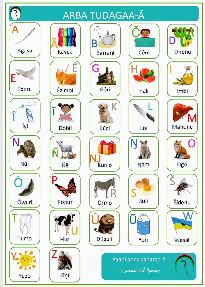من الأهداف الرئيسية التي قامت عليها #جمعية_أبناء_الصحراء هي دعم تدريس وتطوير اللغة التباوية، وهذه كانت من أهم أهداف رواد الجمعية، ووضعوا على عاتقهم تحقيق هذا الهدف، وذلك لما تمثلها اللغة التباوية من أهمية للمجتمع التباوي.