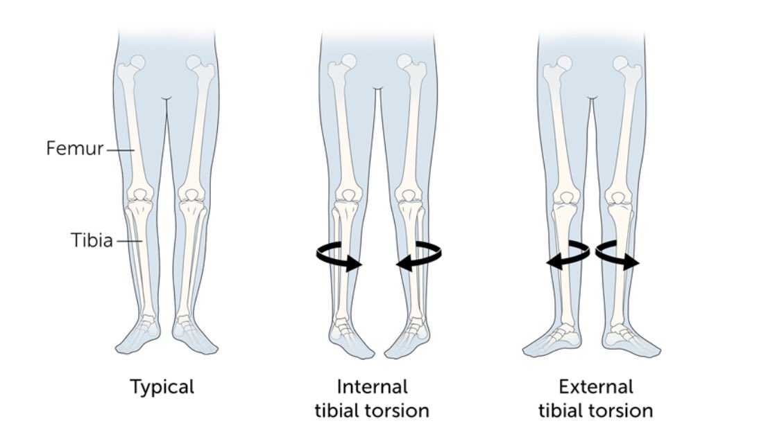 ١٢ السبب الثالث دوران الفخذ للداخل (المعروف أيضًا باسم التواء الفخذ المفرط) غالبًا ما يكون واضح عند ٥ أو ٦ سنوات من العمر.