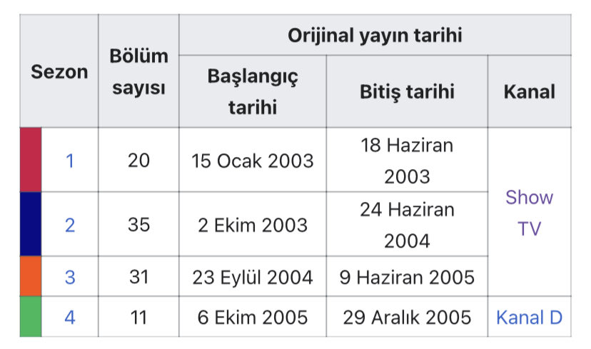 بدا عرض الحلقه الاول بتاريخ 15 يناير عام2003 حتى عام 18 يونيو 2003 ب20 حلقه فقط في الموسم الاول الذي كان على قناة ShowTV