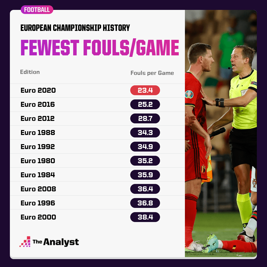 وقد أدى ذلك إلى قيام يورو 2020 بإنتاج أقل عدد من الأخطاء في المباراة الواحدة في أي بطولة منذ عام 1980 ، كما أن عدد التوقفات الأقل في اللعب أتاح تدفق المباريات بحرية.
