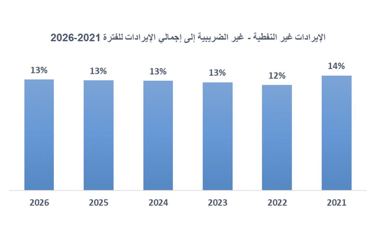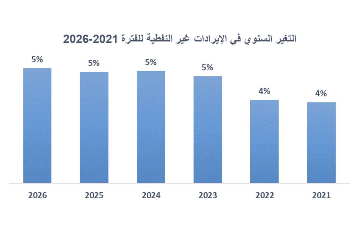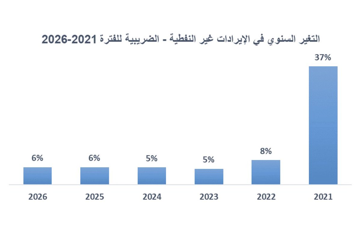 لمحة سريعة عن التطور المتوقع للإيرادات غير النفطية الضريبية ومعدل نموها وما ستشكله كنسبة من إجمالي الإيرادات خلال 2021-2026: