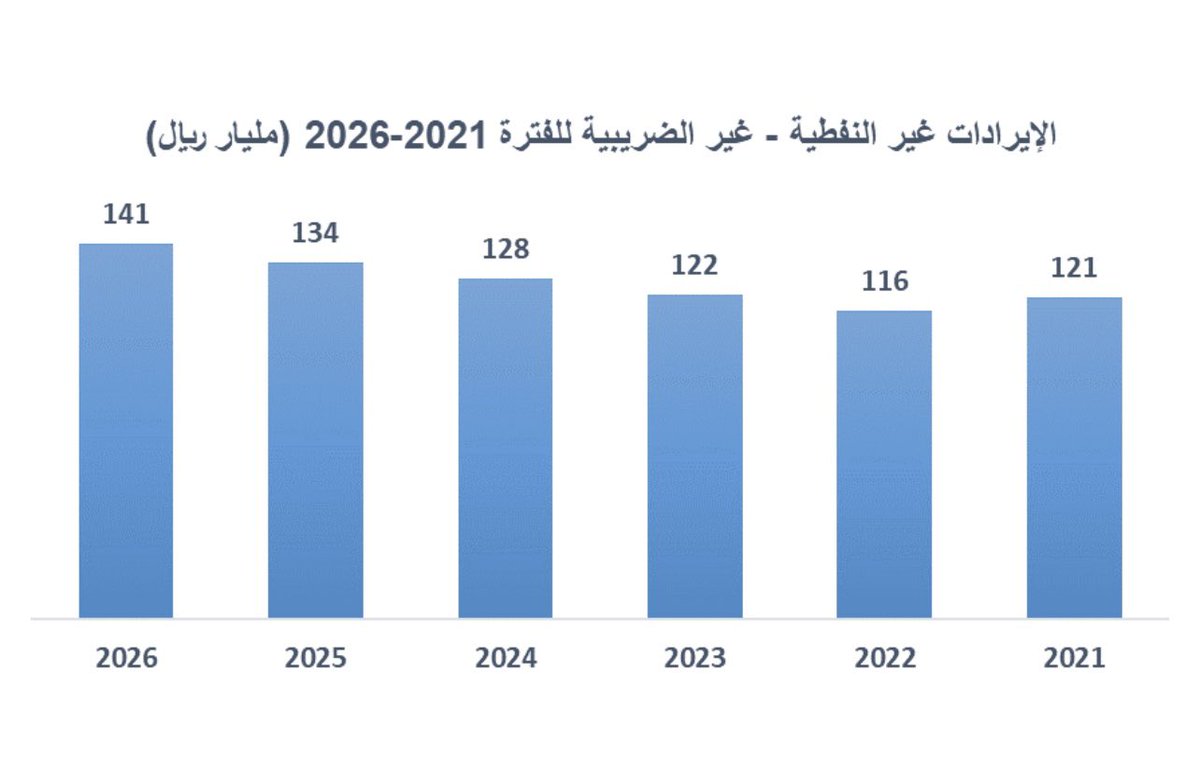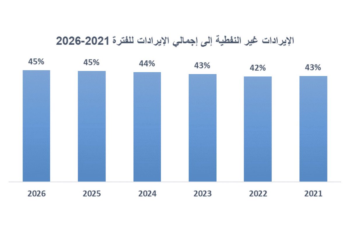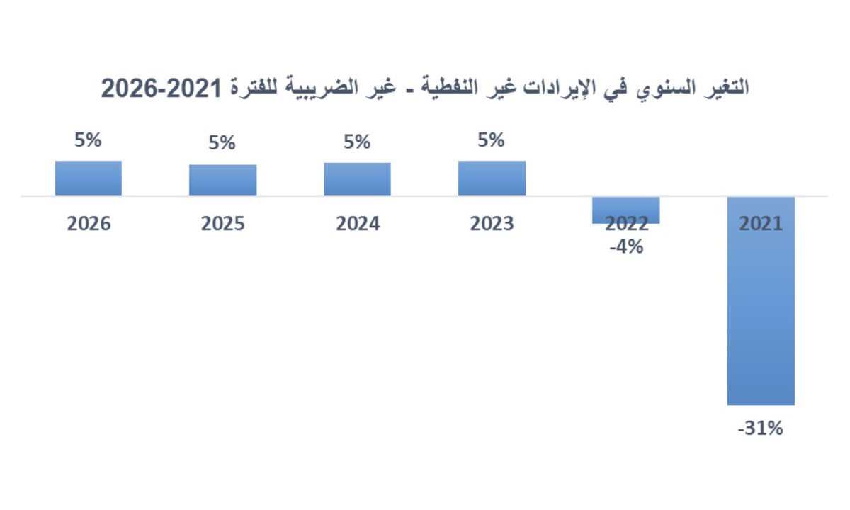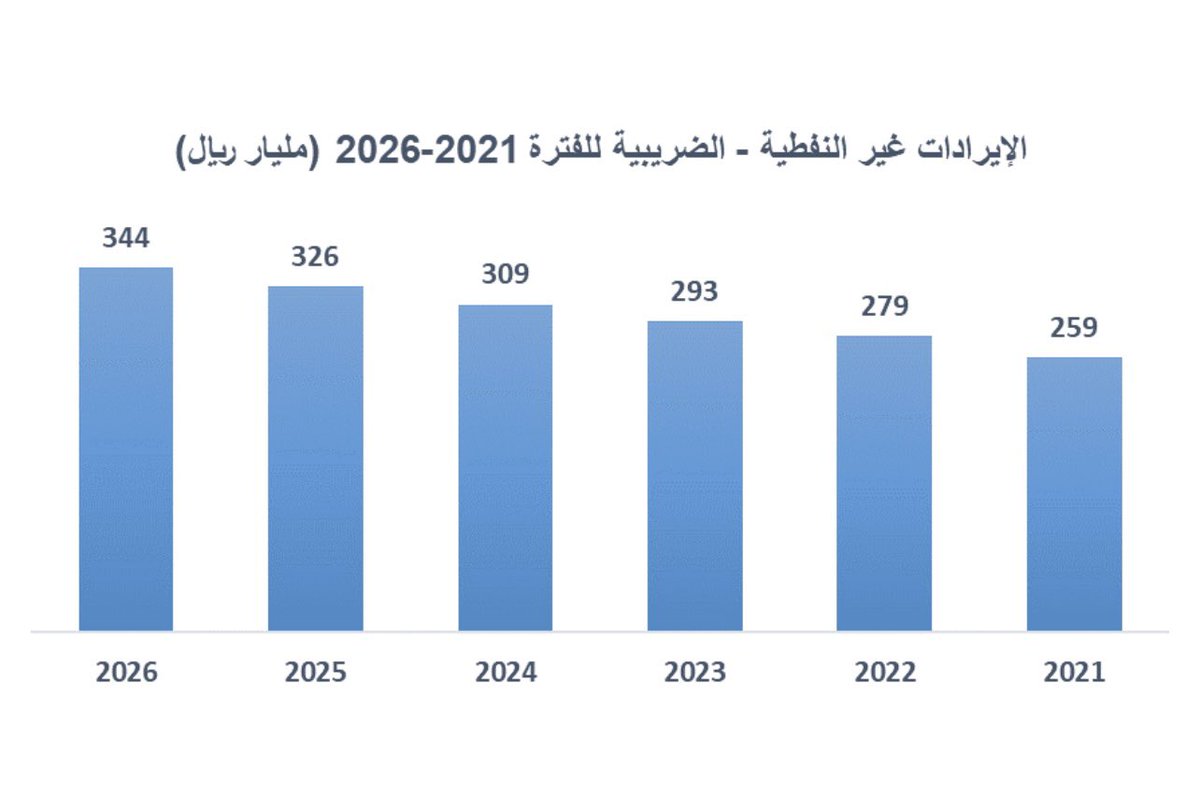 لمحة سريعة عن التطور المتوقع للإيرادات غير النفطية الضريبية ومعدل نموها وما ستشكله كنسبة من إجمالي الإيرادات خلال 2021-2026: