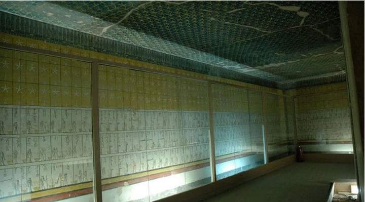 6-وقد كتبت بالخط الوسط بين الخطين الهيروغليفى والهيراطيقى ويحمل سقفها عمودين ويوجد على جانبيها أربعة حجرات صغيرة وزعت بمعدل حجرتين على كل جانب وقد صُممت المقبرة لتتناسب مع المسالك الملتوية فى العالم الآخر ونجد أن غرفة الدفن لها شكل بيضاوي 👇
