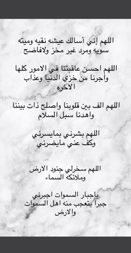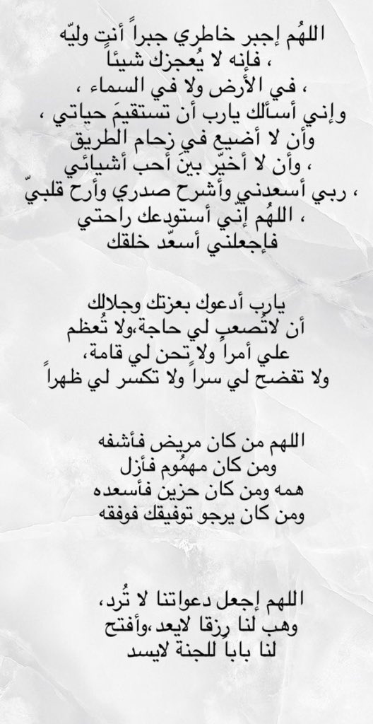 يارب لا وخزة في القلب ولا شوكة في الدرب، وإجعلني خفيفه على الحياة و قلوب الناس، وأعوذ بك ربي من شر التحسر على أشياء رحلت ولن تعود، اللهُم إني أعوذُ بك من شعور لا يُشكى ولا يزول ثقله، اللهُم اجبر قلبي وخاطري فليس لي سواكَ اللهُم اني أسألُك الرزق العظيم الذي لا ينتهي.. 🙏🏼🤍