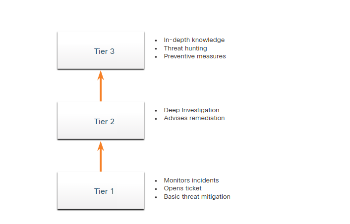 إذا لم يتمكن المستجيب للحادث من حل التذكرة، فسيتم إعادة توجيهها إلى أفراد المستوى 3 ممن لديهم معرفة عميقة ومهارات صيد التهديدات.