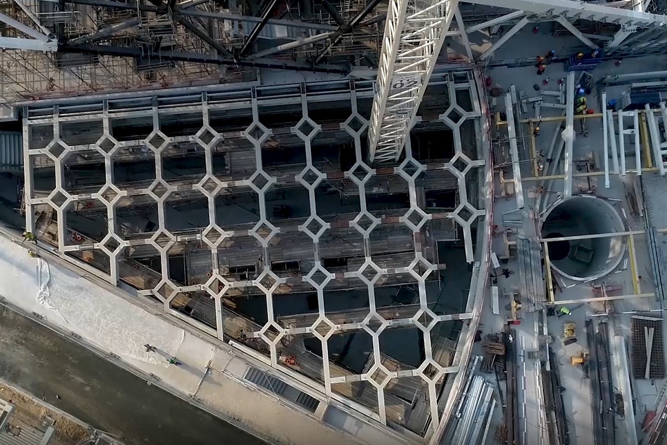 الهيكل الانشائي تم تصميمه بهذا الشكل ليسهل التعرف عليه من قبل زوار المعرض وهو عبارة عن مستطيل عاكس موضوع بزاوية ممتدة من الأرض وموجه نحو السماء في إشارة لتخطي جميع الحدود وأن السقف عنان السماء.