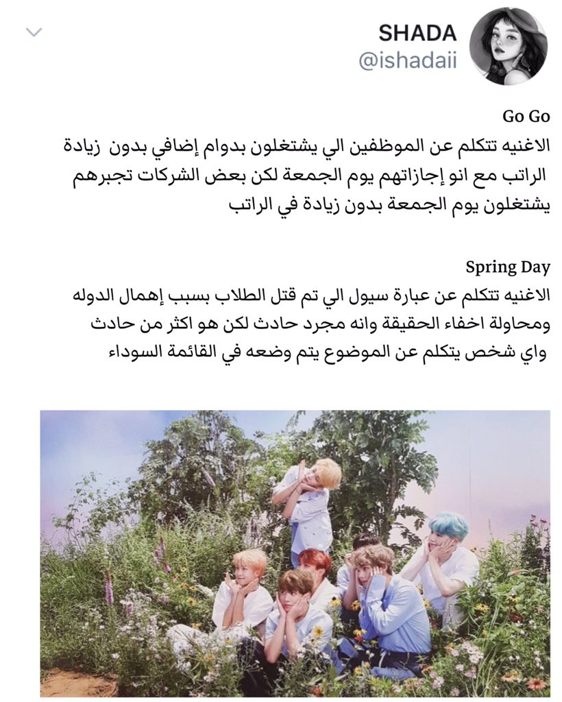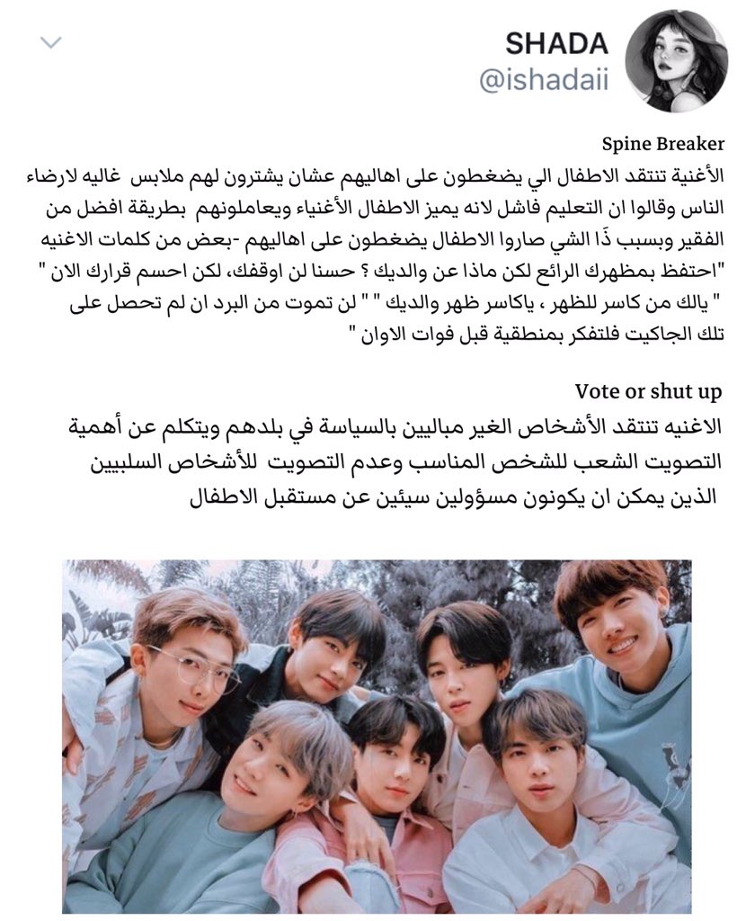 بانقتان معروفين انو اغانيهم تتكلم عن الصحة النفسيه وحب الذات بس للاسف قليل يعرفون انهم اكبر معارضين لحكومة دولتهم وشعبها وبعض القضايا الاجتماعيه وعندهم كثير اغاني تتكلم عن دولتهم وتنتقدهم لدرجة وصل ان كوريا صارت تحضر هذي الاغاني!! هذا راح يكون موضوعنا لهذا ؛الثريد