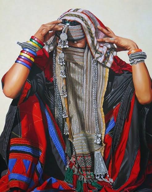 استقبلت جغرافيا جنوب مصر هجرات و ترحال..و منها قبائل مجتمعات الرشايدة التي انتشرت علي فترات من جنوب سيناء وصولا إلي جنوب الصحراء الشرقية .كامتداد ايضا حتي ارتريا و السودان ..بازياءهم الملونة المزركشة مع مطرزات الترتر و الخرز الكثيف ببراعة..يظل جزءا من نسيج ازياء صحراء مصر