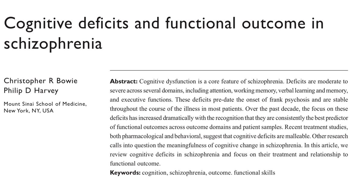 ٤- هنا مراجعة حول الوظائف المعرفية في الفصام وترى بثبات الانخفاض بعد الإصابة بالفترة الذهانية الأولى ويتحدث كيف أن هذه الوظائف المعرفية لدى مرضى الفصام هي أمور مرنة وقابلة للتغير والدلالة وجود أبحاث وتدخلات علاجية متعددة لتحسينها لدى مرضى الفصام