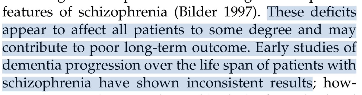 ٨- لذلك توجد دراسات وجدت مرضى مصابون بالفصام يحدث لهم تدهور في (بعض) الوظائف المعرفية، التدهور هذا حسب دراسات كان في الوظائف المتخصصة باللغة والانتباه والوظائف الابصارية المكانية مقارنة بتدهور الذاكرة الذي يحدث أولا لمرضى الألزهايمر