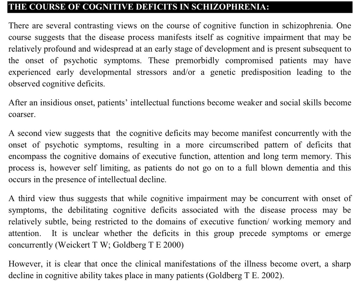 "A rather unique feature of cognitive deficits, as compared to other characteristics of schizophrenia, is that they remain relatively stable within the same patient over time"