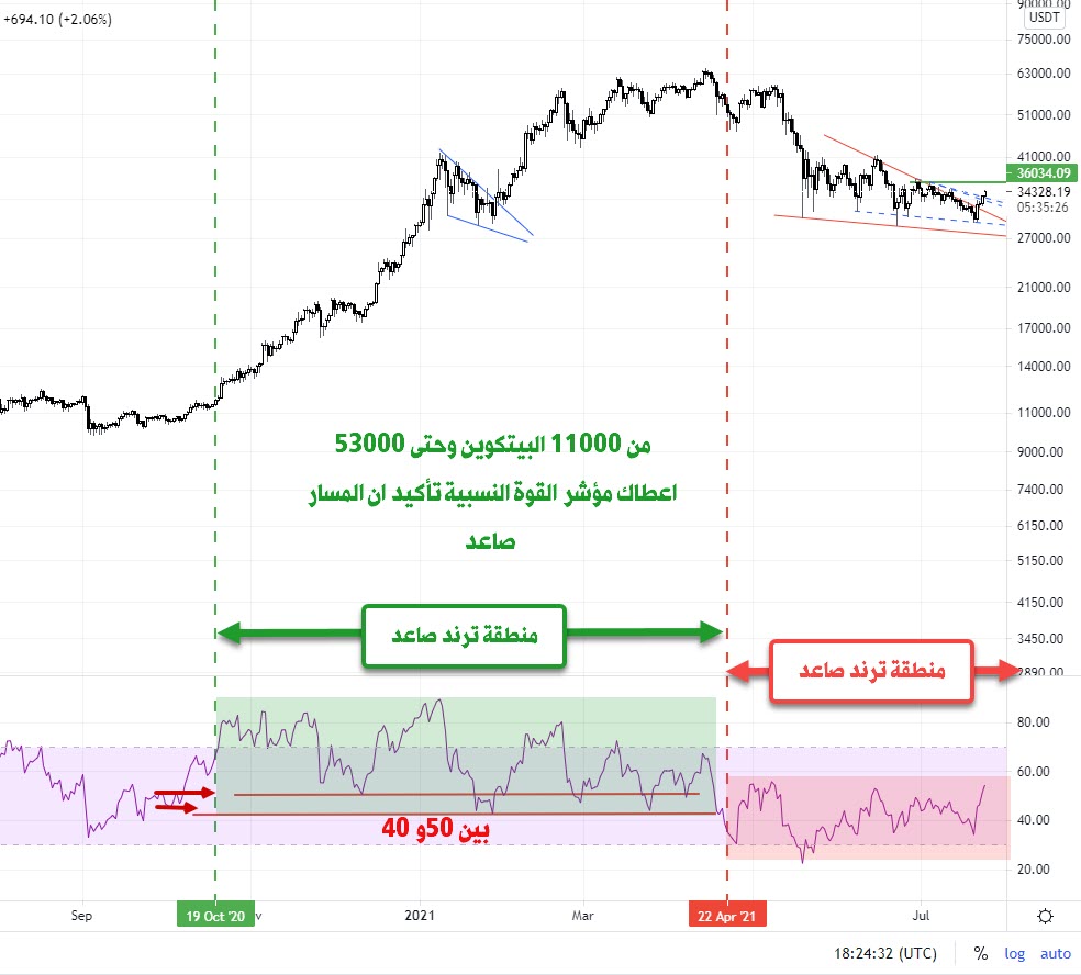 وعندما نكون في مسار صاعد سابقاً، ويبدأ RSI كسر 40-35 هذا تنبيه أول، وعندما يرتد فإنه يفشل ما بين 50-65 تنبيه ثاني لتأكيد الترند الهابط.