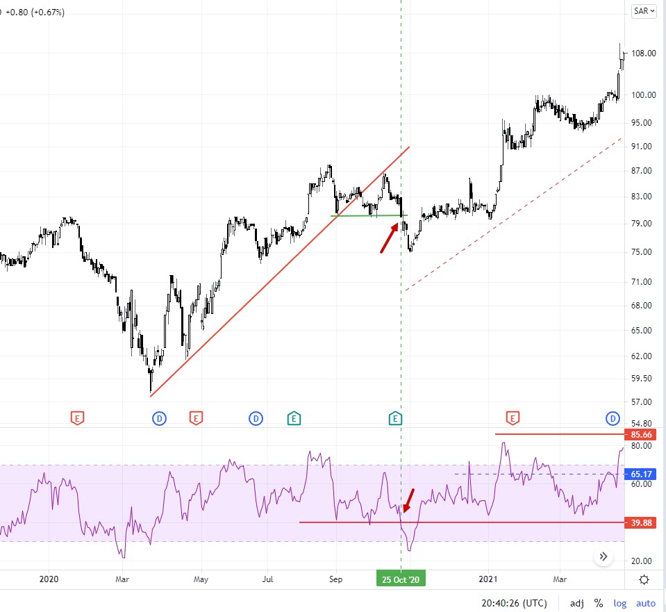 مؤشر RSI ينزل ويكسر 40 يفضل يكسر 35 للتأكيد، حينها تكون لديك إشارة إلى انك بدأت تتحول لمسار هابط.