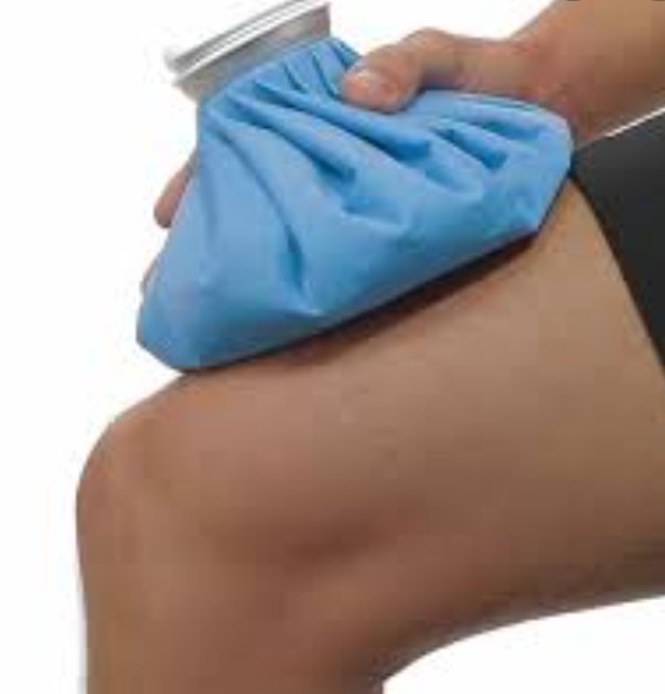 ٢- الثلج : ضع الثلج على الركبة باستخدام  كيس الثلج أو كيس مملوء بالماء البارد للمساعدة على الحد من التورم بعد الإصابة. ضع الثلج عليها لمدة 15 إلى 20 دقيقة من ( أربع إلى ثماني) مرات في اليوم طوال أول 48 ساعة أو حتى يتحسن التورم.