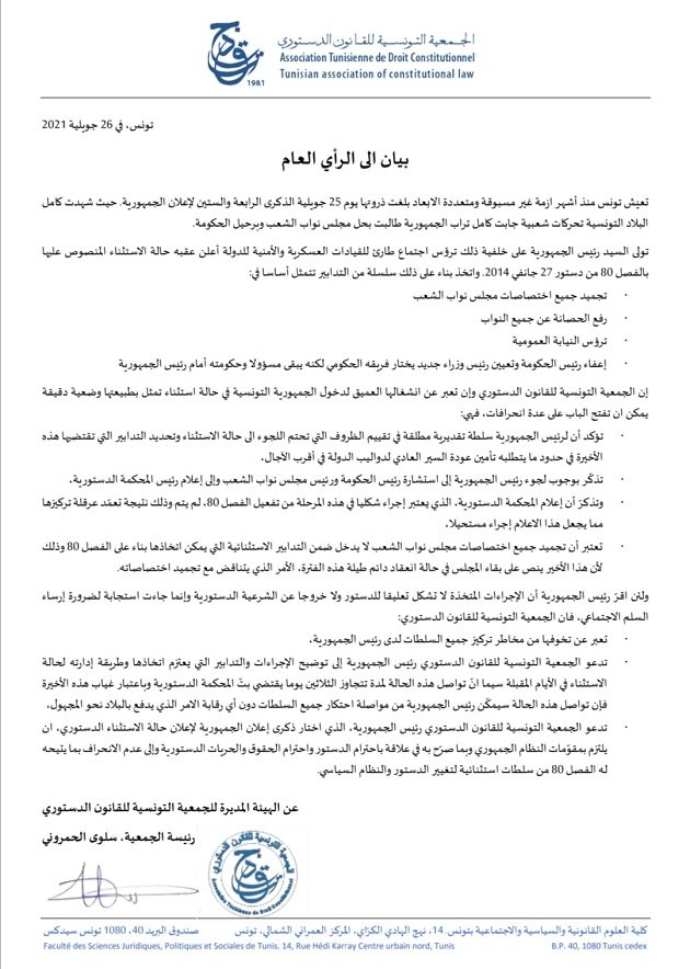 سلوى الحمروني (رئيسة الجمعية التونسية للقانون الدستوري): "تطبيق نص الفصل 80 من الدستور لا يعني الخروج من الدستور ويجب الالتصاق بما ينص عليه الفصل وعدم تجاوزه. أدعو الرئيس لاختصار مدة الحالة الاستثنائية قدر الإمكان والتمسك بالدستور واحترامه وتوضيح الإجراءات والتدابير للرأي العام."