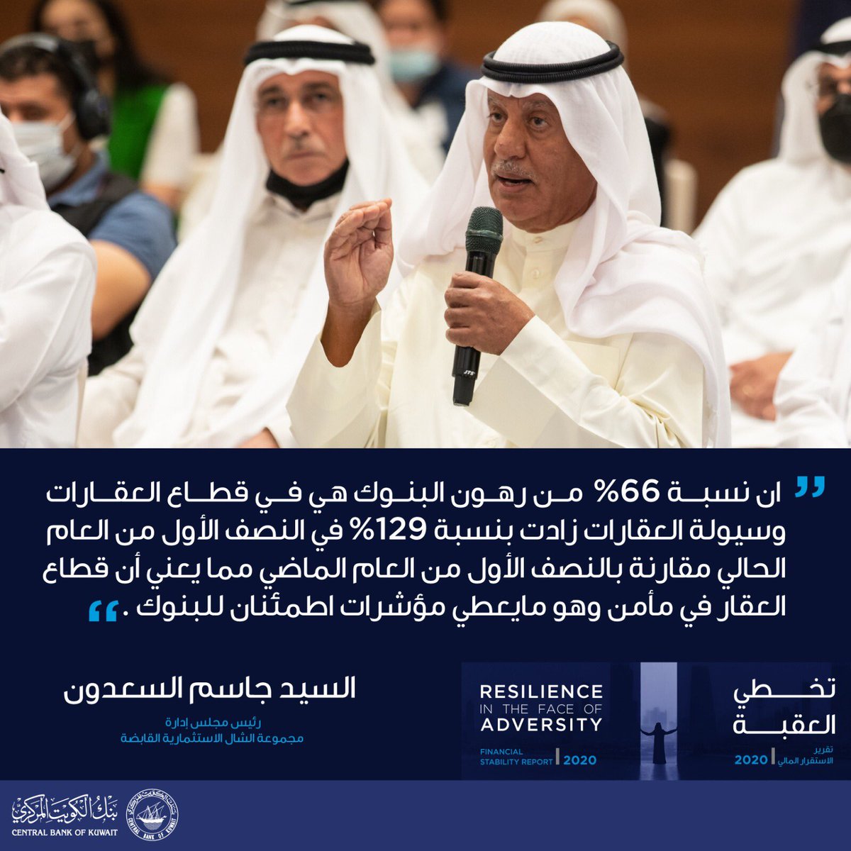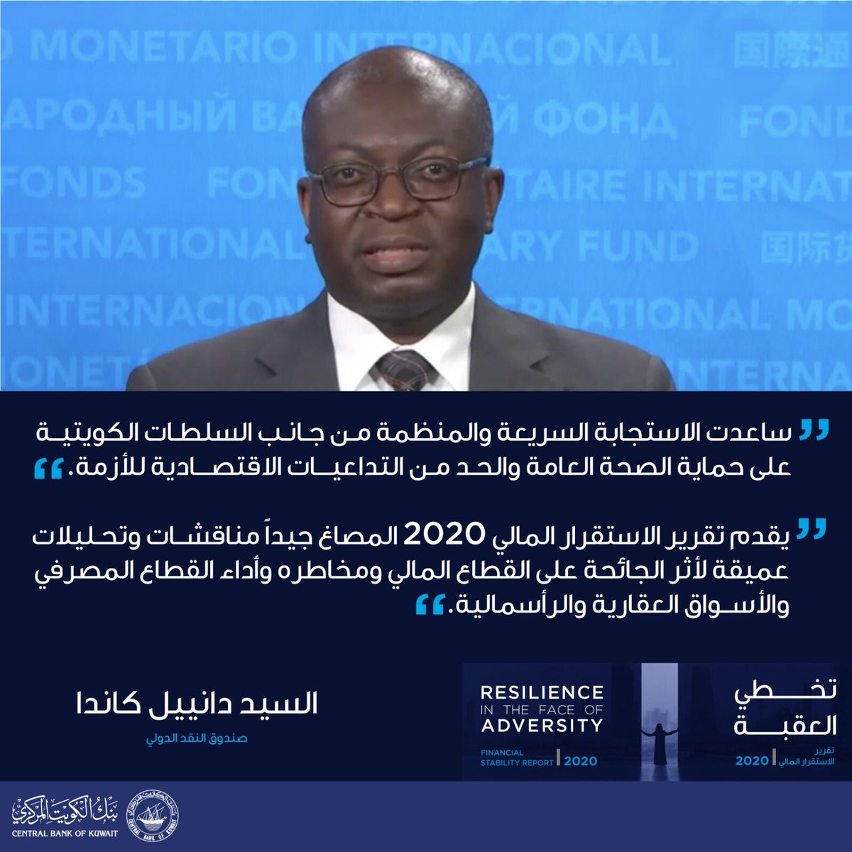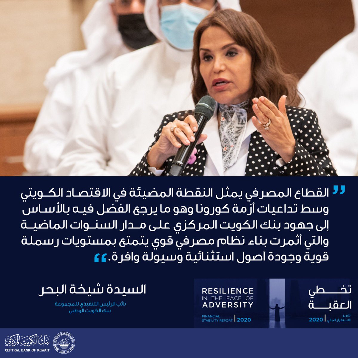 "القطاع المصرفي يمثل النقطة المضيئة في الاقتصاد الكويتي وسط تداعيات أزمة كورونا وهو ما يرجع الفضل فيه بالأساس إلى جهود بنك الكويت المركزي على مدار السنوات الماضية والتي أثمرت بناء نظام مصرفي قوي يتمتع بمستويات رسملة قوية وجودة أصول استثنائية وسيولة وافرة".