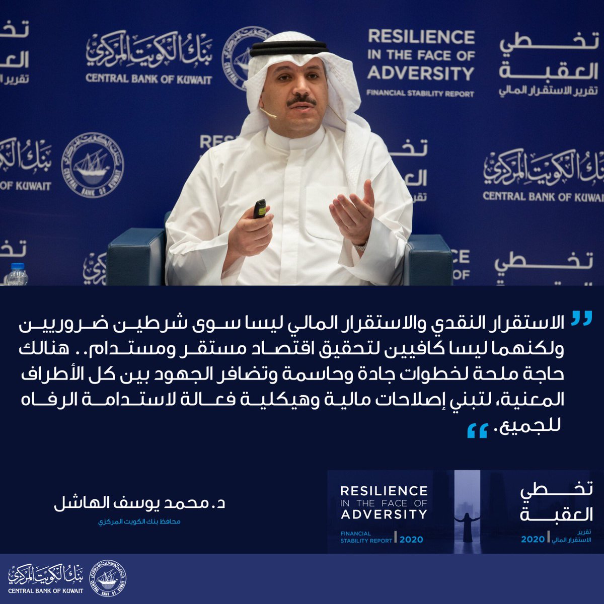 "الاستقرار النقدي والاستقرار المالي ليسا سوى شرطين ضروريين ولكنهما ليسا كافيين لتحقيق اقتصاد مستقر ومُستدام.. هنالك حاجة مُلحة لخطوات جادة وحاسمة وتضافر الجهود بين كل الأطراف المعنية، لتبني إصلاحات مالية وهيكلية فعّالة لاستدامة الرفاه للجميع".