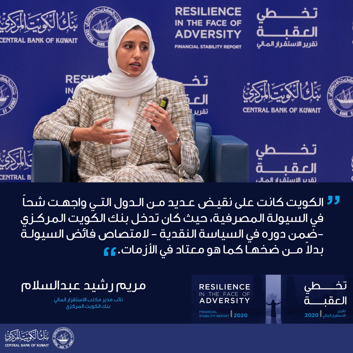 "الكويت كانت على نقيض عديد من الدول التي واجهت شُحاً في السيولةالمصرفية، حيث كان تدخل بنك الكويت المركزي -ضمن دوره في السياسة النقدية- لامتصاص فائض السيولة بدلاً من ضخها كما هو معتاد في الأزمات".