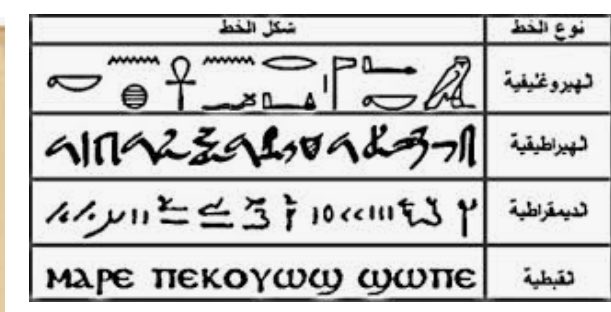و عندنا كمان المرحلة الديموطيقية Demotic: وهي مرحلة احدث عن مرحلة اللغة في العصر المتأخر. و دي بدأت في الظهور حوالي القرن الثامن قبل الميلاد وفضل استخدامها مستمر حتى القرن الخامس الميلادي الكتابة القبطية Coptic: وهي المرحلة الأخيرة من مراحل اللغة المصرية القديمة، و دي جات