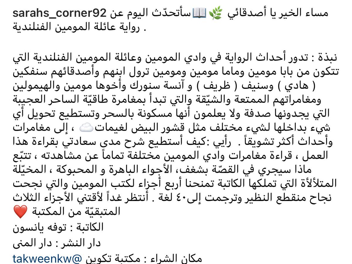 قراءة مغامرات وادي المومين مختلفة تماماً عن مشاهدته ، تتبّع ماذا سيجري في القصّة بشغف، الأجواء الباهرة و المحبوكة ، المخيّلة المتلألأة التي تملكها الكاتبة تمنحنا أربع أجزاء لكتب المومين والتي نجحت نجاح منقطع النظير وترجمت إلى٤٠ لغة. من شخصيّاتي المفضّلة هادي ومي❤️