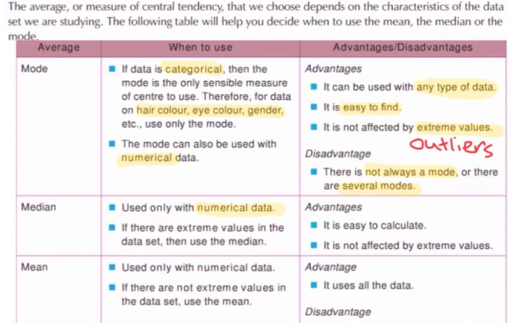 يستخدم المتوسط mean مع البيانات الاقرب في توزيعها للتوزيع الطبيعي وخاليه من القيم الشاذه outliers. بينما يستخدم median مع البيانات اللي توزيعها تختلف عن الطبيعي ومعها قيم شاذة. أما المنوال فيستخدم للبيانات الكمية وهي القيمة الأكثر تكرارا