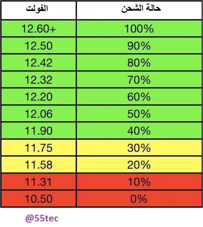 البطارية السليمة هي القادرة على توليد فولت لايقل عن 9 فولت في لحظة تشغيل المحرك Cranking لذا قد تجد أن البطارية مشحونة بالكامل +12.6 فولت ولكن في لحظة تشغيل المحرك يهبط الى أقل من 9 فولت ثم يعود إلى 12.6 فولت وهذا يعني قرب انتهاء البطارية (وهو الأغلب)