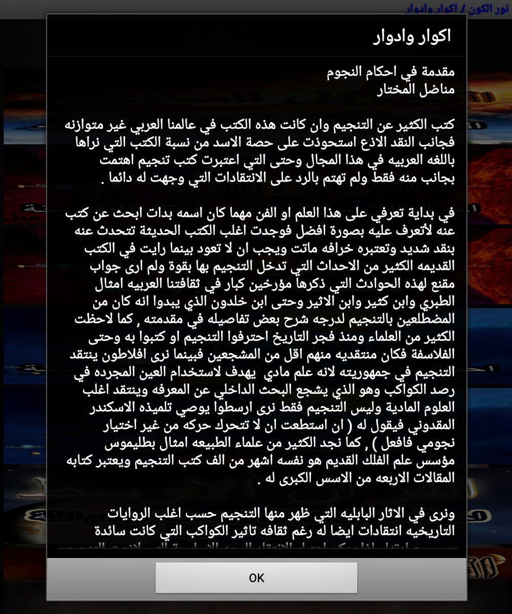 كل قسم تفتحه بنور الكون تظهر لك رسالة تشرح لك شيء من اسرار هذا القسم فمع ان نور الكون تطبيق على الموبايل فقط ولكني ركزت على جعله موسوعه علمية ايضا وليس برنامج تطبيقي فقط . فهو يدفعك للتعلم اكثر كلما تصفحته اكثر