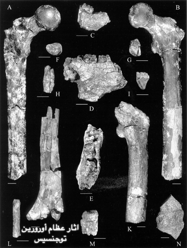 ٢-سلف أورورين توجنسيس (Orrorin Tugenensis) : عاش قبل ٦ ملايين سنة، صفاته اسنانه قصيرة وهي ثاني اقدم سلف، دُرست تاريخه من اهم اكتشاف اشباه البشر وهو عظم الفخذ العلوي منه واستنتجوا العلماء أنهم كانوا يمشون على القدمين إضافة لتسلق الأشجار وهذا اول دليل على انهم كانوا ذو القدمين.
