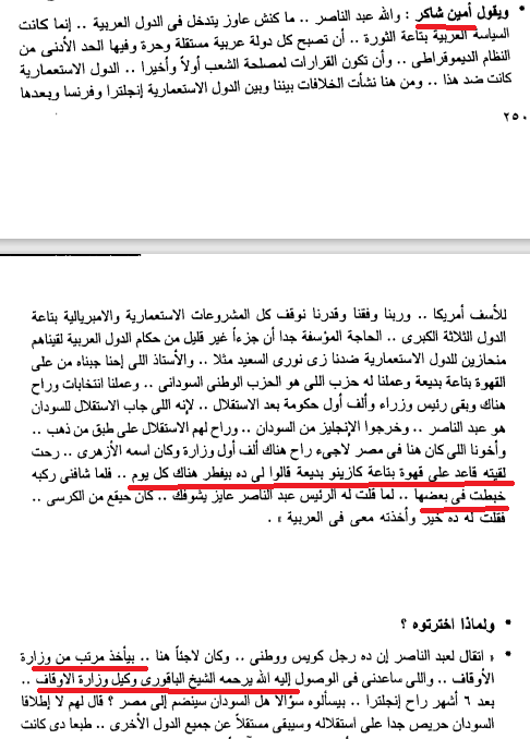 أمين شاكر: كان هناك سوداني لاجئ في مصر اسمه إسماعيل الأزهري، وكانت وزارة الأوقاف تصرف له راتبا شهريا، قالوا لعبد الناصر "الأزهري شاب وطني"، وأخبرني الباقوري أن الأزهري يتناول وجية الإفطار يوميا على قهوة كازينو بديعة، فذهبت إليه وأخبرته أن عبد الناصر يريد مقابلته فارتعدت فرائصه=