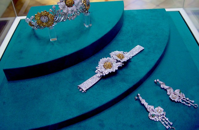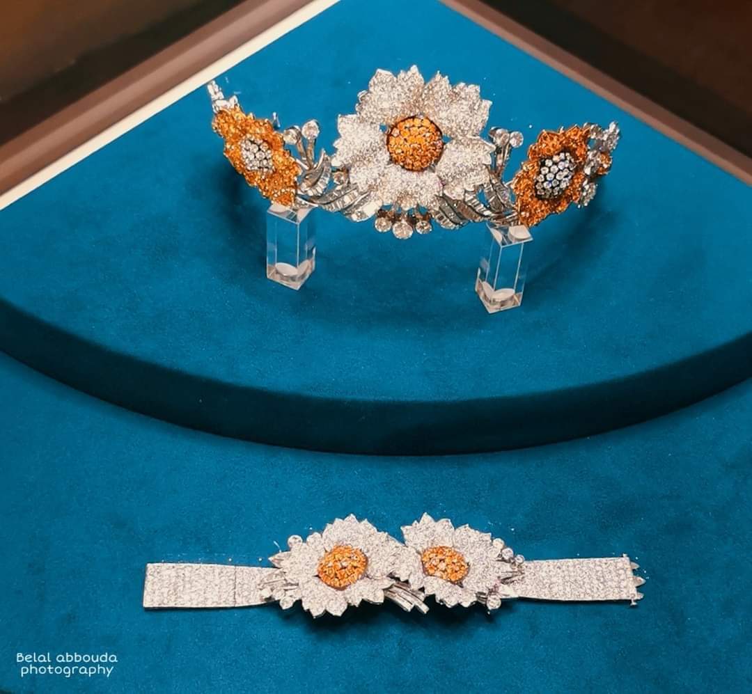 11-مجموعات الأميرات فوزية أحمد فؤاد وفائزة أحمد فؤاد: «أ»مجموعة من الاساور والتوك ودبابيس الصدر من أهمها:توكة من البلاتين المرصع بالماس عليها اسم «فوزية»-عقد ذهب مرصع بالماس البرلنت واللؤلؤ «فائزة»ومجموعة الأميرات سميحة وقدرية حسين كامل.