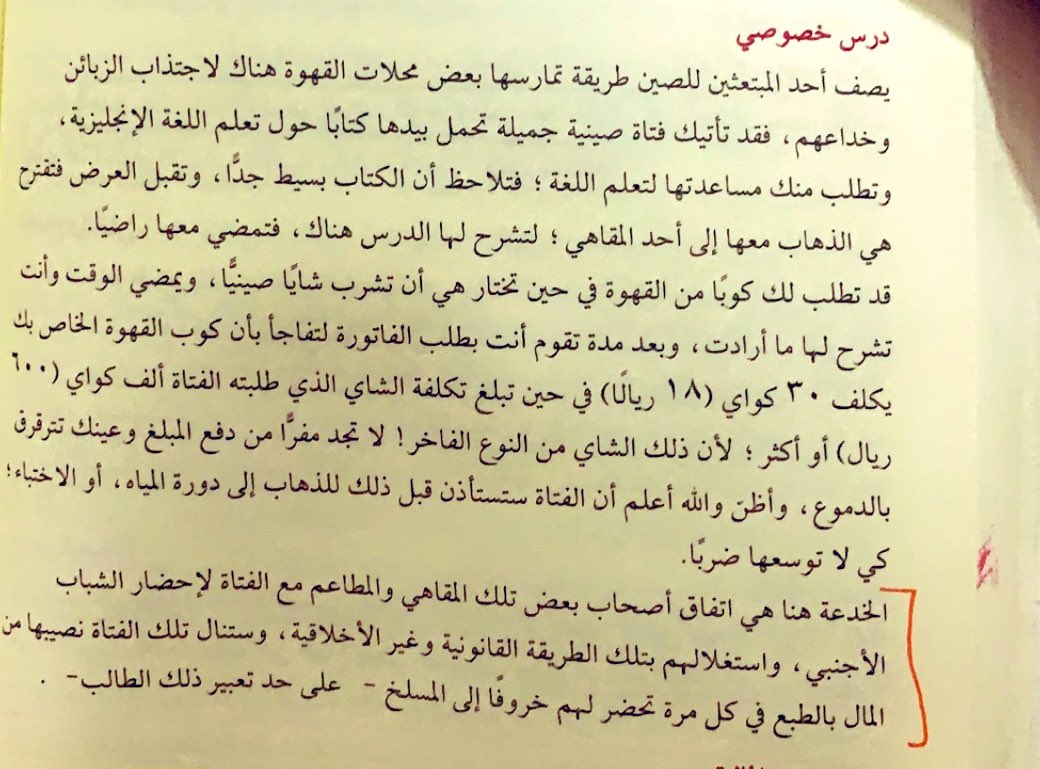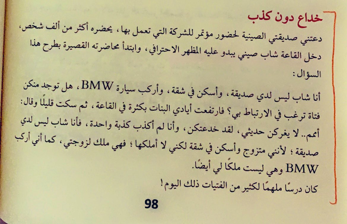 قصة في خداع بعض الصينيين "ذكر أن أحد التجار العرب اشترى آلة أو بضاعة بمبلغ مليون دولار تقريبًا ، ومن شدة حرصه على ألا يخدعه الصينيون ذهب للميناء ، وشاهد البضاعة بنفسه وقت شحنها ، ومع ذلك تفاجأ بعد عودته لبلده واستلامه لها بأنها مزيفة ".