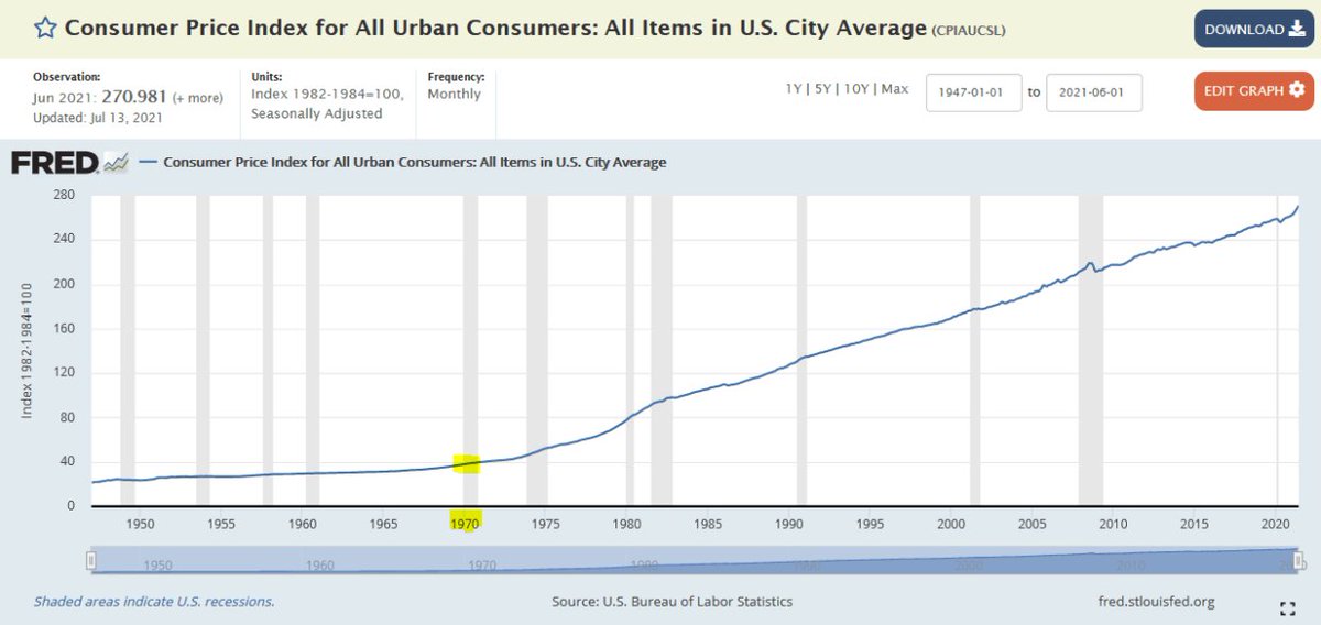 التضخم قاتل مطلق ، حتى لو كنت تعيش في ظل نظام "تضخم مستقر". يمكنك أن ترى مؤشر أسعار المستهلك الأمريكي يرتفع بسرعة بعد أن خرجو عن معيار الذهب في عام 1971. كان التضخم ضعيفًا حتى تلك النقطة ، ثم ارتفع بشكل مباشر. هذه ثروتك تتم سرقتها على مدى عقود.