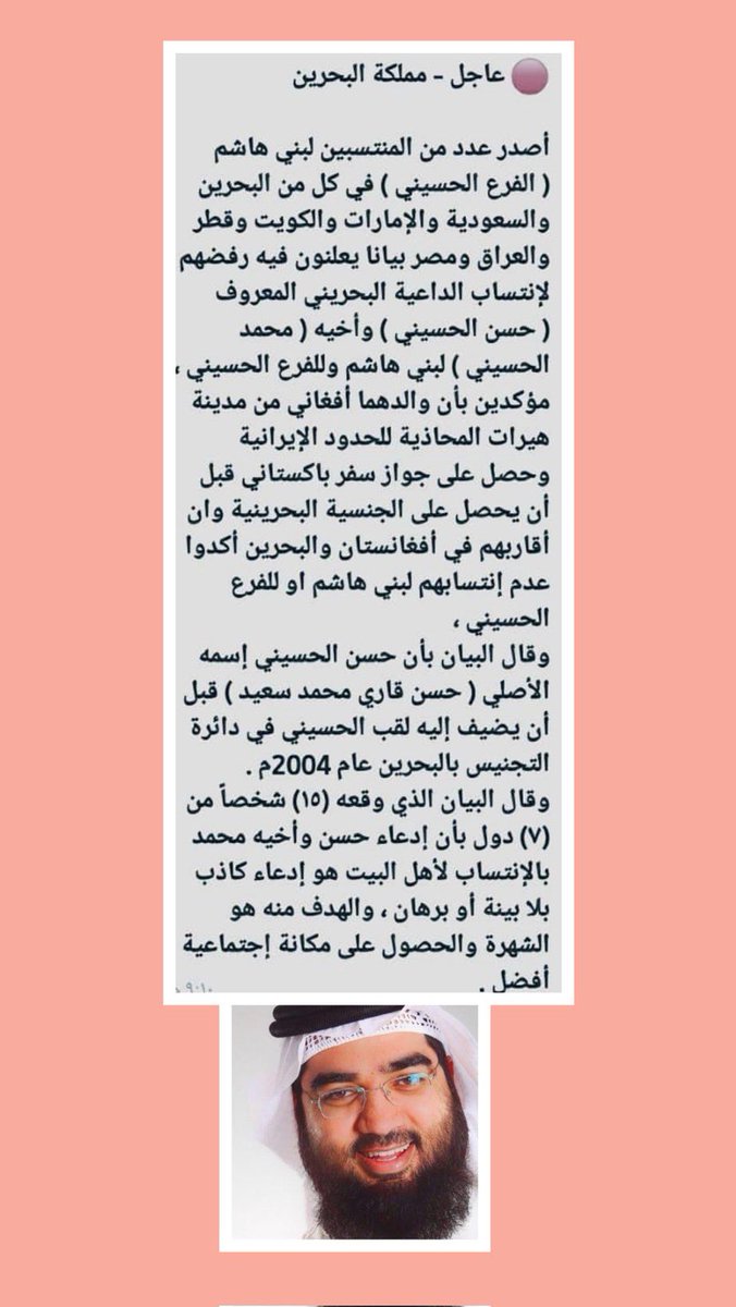 *أصدر عدد من المنتسبين لبني هاشم ( الفرع الحسيني ) في كل من البحرين والسعودية والإمارات والكويت وقطر والعراق ومصر بيانا يعلنون فيه رفضهم لإنتساب الداعية البحريني المعروف ( حسن الحسيني ) وأخيه ( محمد الحسيني ) لبني هاشم وللفرع الحسيني ،