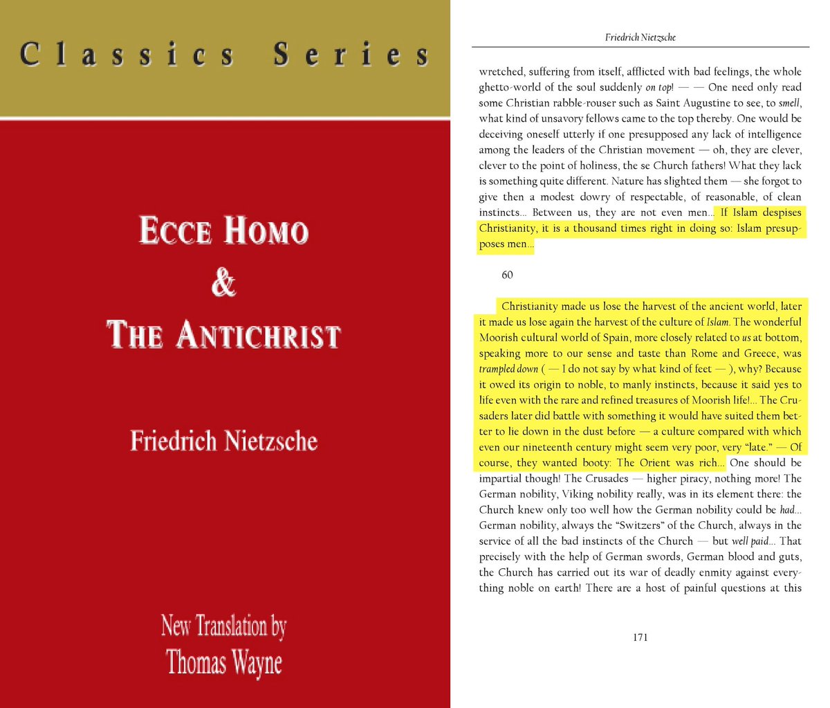 " وعندما يبدي الإسلام احتقاراً للمسيحية فإن معه ألف حق في ذلك،فالإسلام يفترض فحول رجال شرطاً لوجوده، لا أشباه خصيان وجبناء "!