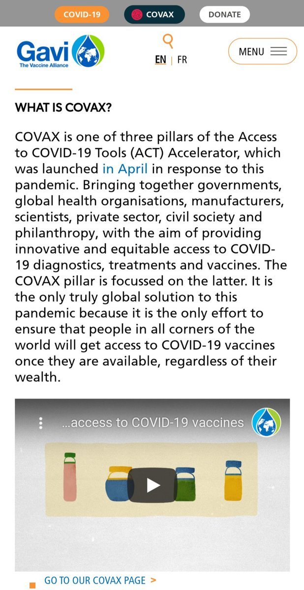 كوفاكس: COVAX واحدة من ٣ اعمدة للدخول الى مسرع ادوات كوفيد١٩ انشئ في ابريل ٢٠استجابة للوباء يجمع: الحكومات،منظمات الصحة في العالم،مصنعي اللقاح،العلماء،المجتمع المدني،والاعمال الخيرية بهدف توفير مدخل مستحدث لفحوصات،وعلاجات،ولقاحات #كوفيد١٩