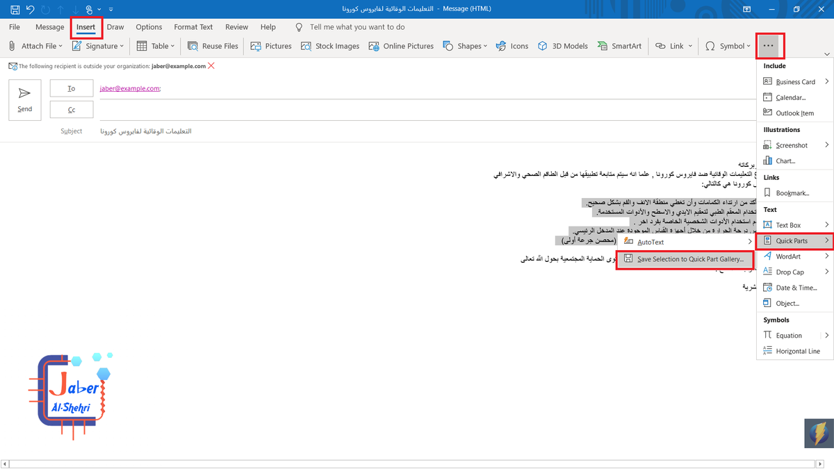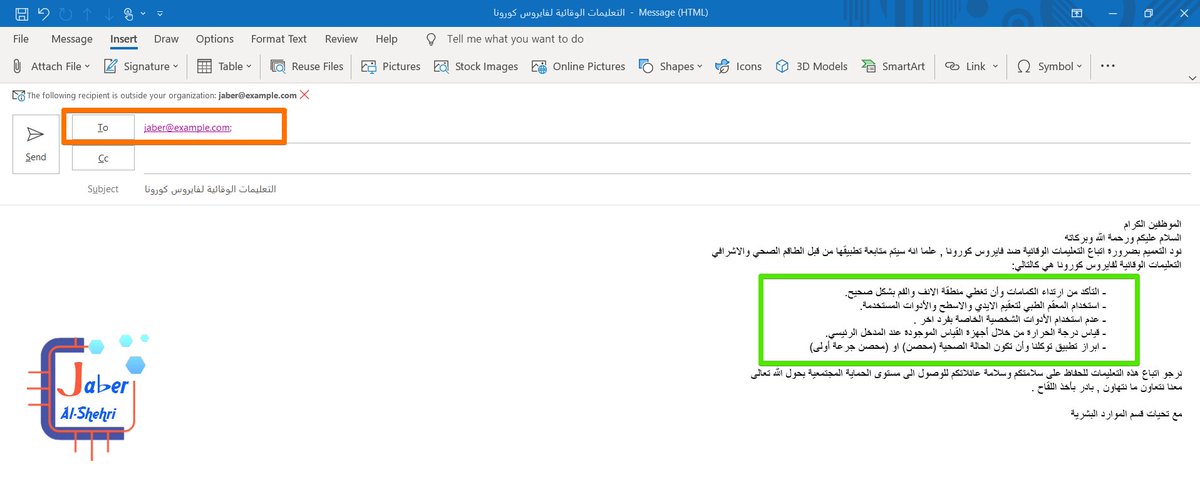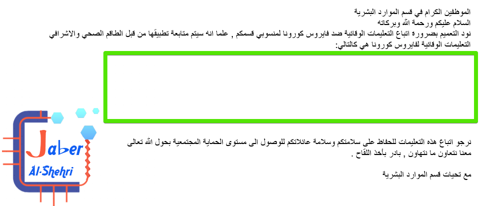 وبهذا الايميل مجموعة من التعليمات الوقائية من فايروس كورونا . انت لاتريد بالتأكيد تكرار كتابة هذه التعليمات مرارا وتكرارا عند ارسال كل ايميل الى موظفي كل قسم .