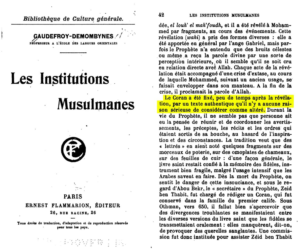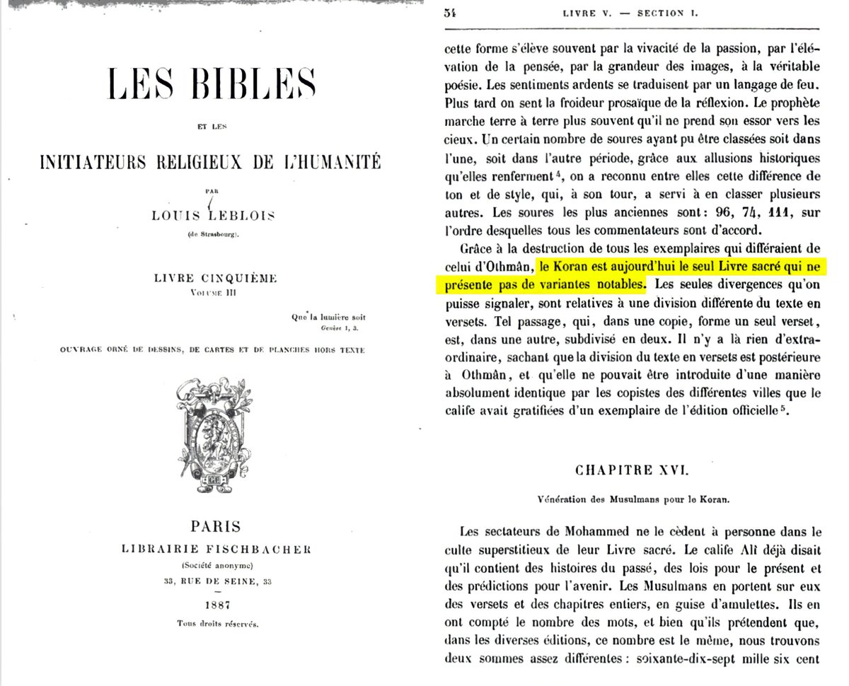 " وليس هناك أدنى شك في أن القرآن الذي يُقرأ اليوم أينما كان المسلمون هو نفس المصحف الذي نُسخ من مصحف حفصة..القرآن هو العمل الوحيد الذي عاش أكثر من اثني عشر قرناً دون أن يبدل فيه، ولا يوجد شيئ يمكن أن يقارن بهذا أدنى مقارنة لا في اليهودية أو المسيحية.