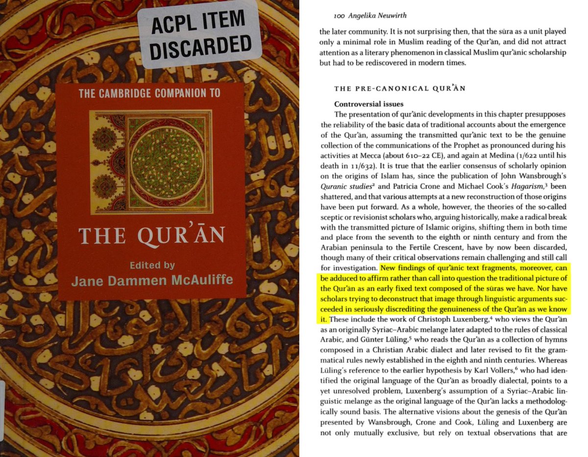 النتائج الحديثة لدراسة أجزاء النص القرآني أَكّدت الشكل التقليدي للقرآن كنص مبكر ثابت يتكون من السور التي لدينا . . . ولم ينجح العلماء الذين حاولوا التشكيك الجاد في أصالة القرآن كما نعلم