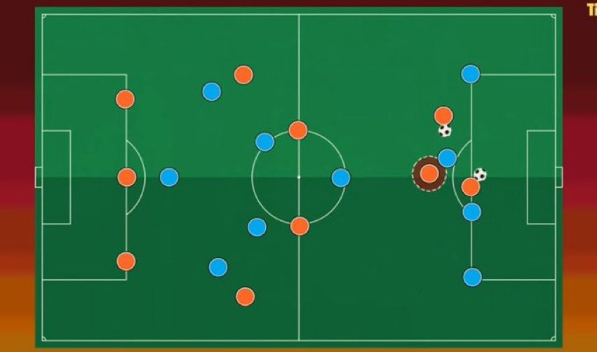 5. بمجرد وصول الكرة للمهاجم، يعمل المهاجم [ دجيكو] على استخدام جسمه للحفاظ على الكرة - ثم تمريرها للجناحين الذين سيتحركان بخلفه تجاه مرمى الخصم، او تمرير الكرة للاعب وسط سوف يزيد بالهجمة ..