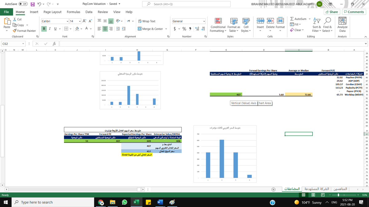 بطريقة أخرى كأننا نقول لو متوسط مكرر الربحية بين المنافسين 6 اضعاف وارباح الشركة 10 ريال فقط للسهم اذا السعر العادل حسب المنافسين هو 60 فقط