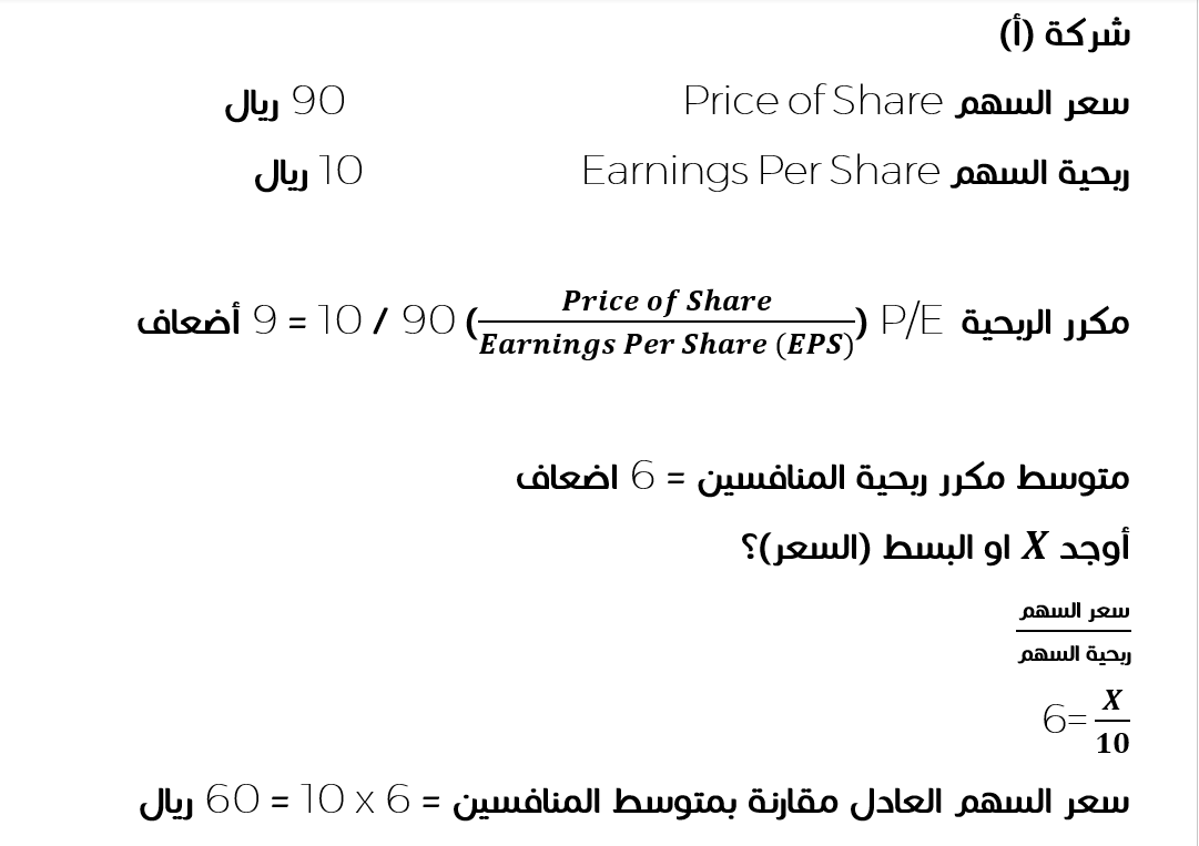 مثلا لو عندنا شركة ربحية السهم Earning Per Share فيها 10 ريال وسعر السهم 90 ريال اذا مكرر الربحية 90 / 10 = 9 هل السعر معقول مقارنة بالربحية؟ عشان نحدد لازم نقارن بالمنافسين لو قلنا متوسط مكرر ربحية المنافسين 6
