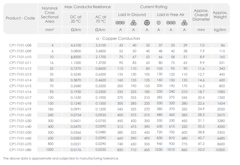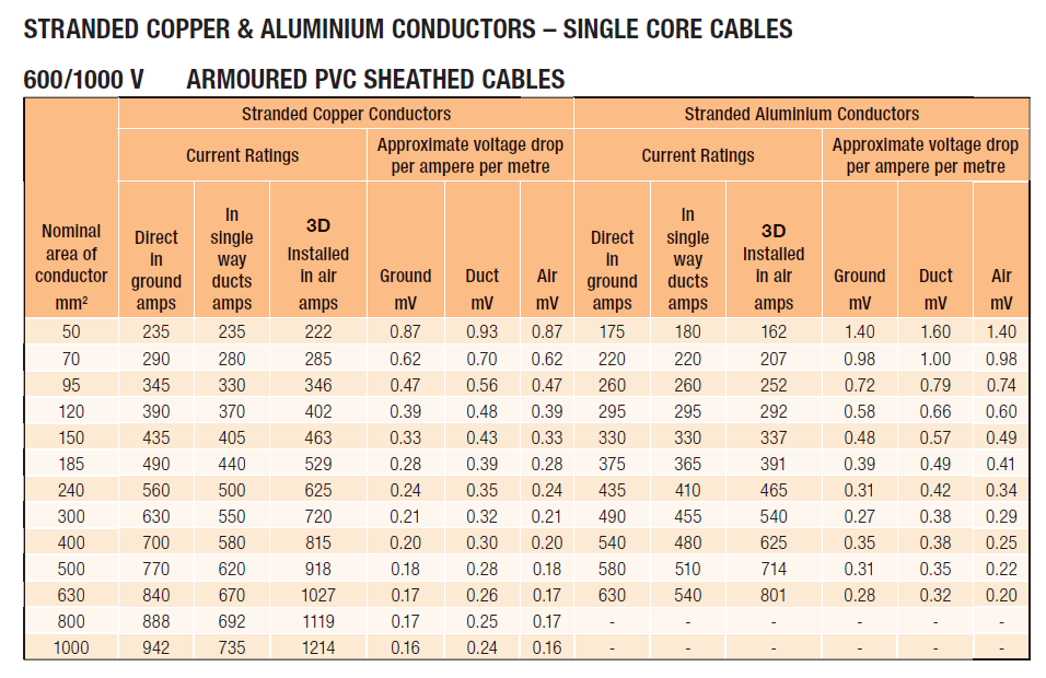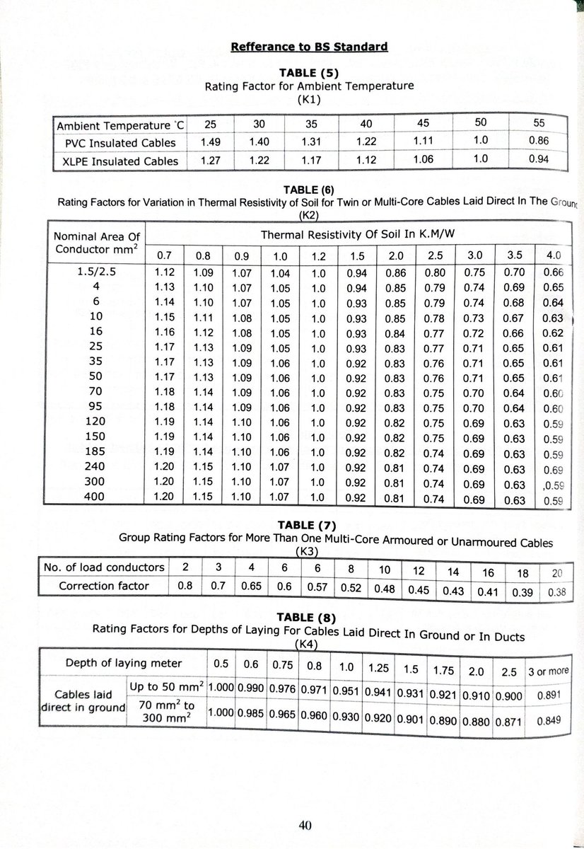 مهم جداً إنك تختار الجدول الصحيح المطابق لإستخدامك. فالجداول هذه تختلف بآختلاف مقدار الجهد على الكيبل، نوع مادة العزل (مثل XLPE أو PVC) ونوع تسليح الكيبل وأحياناً أمور أخرى. (يتبع)