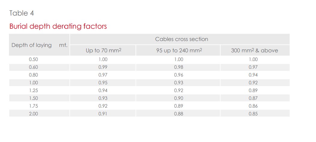 مُصنع الكابل سيوفر جداول إضافية فيها قيم تُعرف بمعاملات خفض التقنين Derating Factors. كيف يتم إستخدامها؟ لنقل أن تيار الحمل 28A وأنت قررت تمد الكيبل تحت الأرض، بالتالي إخترت كابل حجمه 4mm2 لأنه يتحمل تيار مقنن لحد 42A حسب الجدول اللي شفناه فوق. (يتبع)