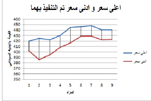 حيث اعلى سعر للمزاد رقم 7 حيث بلغ 448 جنيه/دولار بينما بلغ ثاني اعلى سعر للمزاد رقم 6 حيث بلغ 446 جنيه/دولار، من ناحية اخرى اقل سعر نفذ به المزاد رقم 10 كان 419 جنيه/دولار، و يفرق ب %10- من اعلى (اقل) سعر تم التنفيذ به.