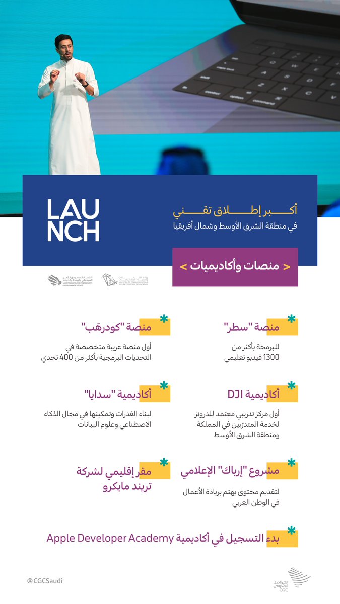 @SAFCSP @McitGovSa في التدريب وصناعة الألعاب ودعم رواد الأعمال؛ شراكات وأحداث تقنية في #أضخم_إطلاق_تقني_في_السعودية. #التواصل_الحكومي