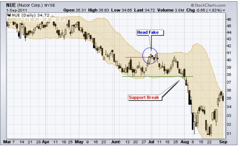 هذه الإشارة الصعودية لا تدوم طويلاً لأن الأسعار تتحرك بسرعة إلى ما دون النطاق العلوي وتنتقل إلى كسر النطاق السفلي ويبدأ مزيف الرأس الهبوطي عندما ينكمش Bollinger Bands وتنخفض الأسعار إلى ما دون النطاق السفلي. هذه الإشارة الهبوطية لا تدوم طويلاً لأن الأسعار تتحرك بسرعة عائدة فوق