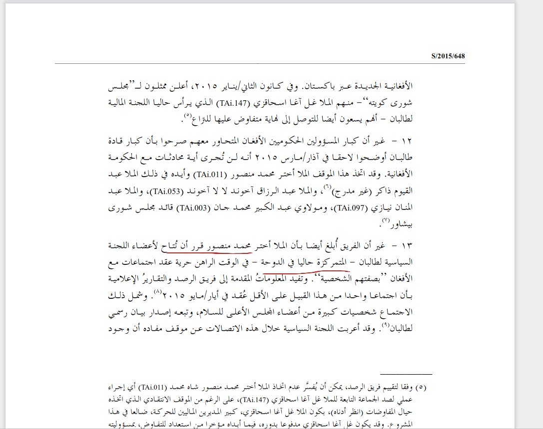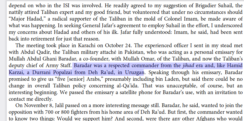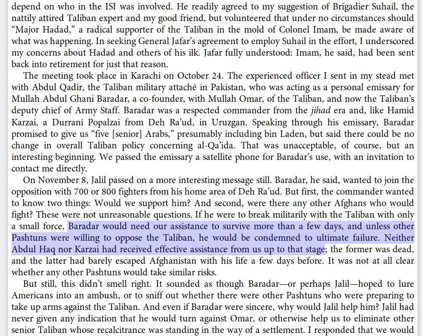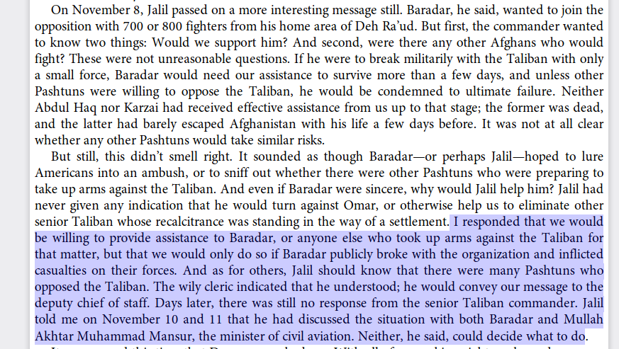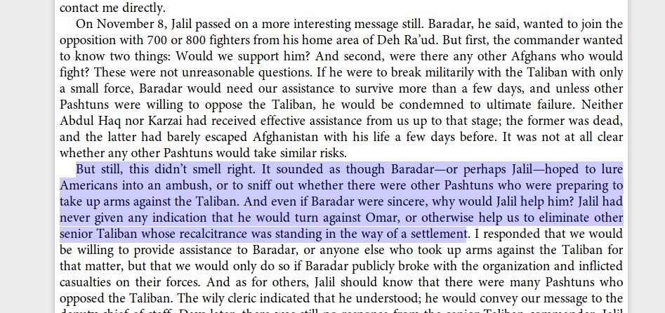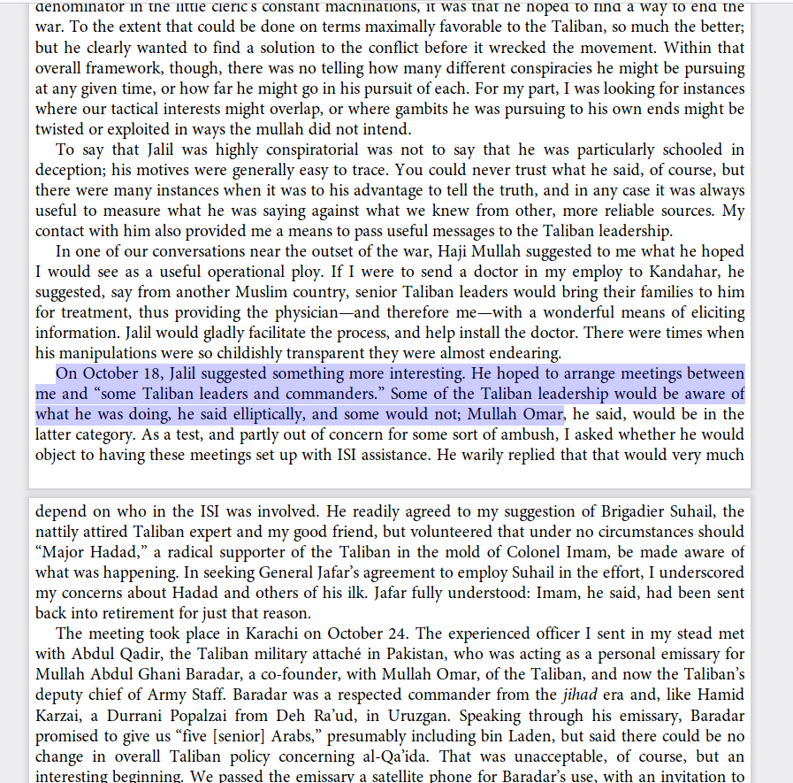 وهي لما قام شخص اخر متخابر معهم اسمه عبدالجليل (مذكور في الشخصيات باسم Mullah Abdul Jalil Akhund وهو نائب وزير خارجية طالبان في 2001) باقتراح عبدالغني برادار على الامريكيين ليتواصلو معه👇
