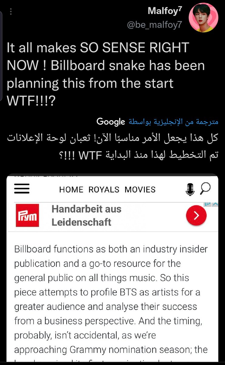 وملاحظة عشان لحد يجي يتفلسف ويقولي تسوين اثارة جدل ، اصلا الكل يعرف انه فيه مؤامرات تصير بحق BTS من الغرب ومعروف البيلبورد ما يحبهم وانا حطيت المصادر وترجمت ونقلت الكلام من الارميز الامريكي فقط لا اكثر .